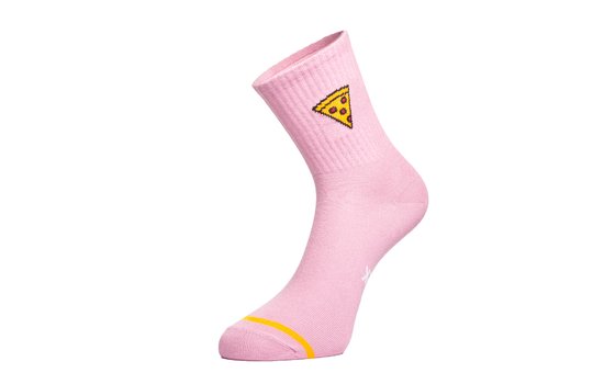 Носки с широкой резинкой, рисунком "Пицца" на голенище и надписью "Еще один кусочек" на стопе.